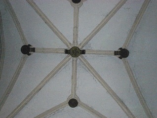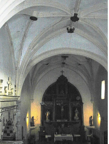 Las uniones ó ménsulas de los arcos de las bovedas presentan distintos motivos y formas, las cuatro triangulares de la bóveda delantera ó del altar mayor representan una columna, una escalera, la corona espinada y los clavos, signos representantivos de la crucifixión y las restantes de forma circular representan motivos florales, excepto dos que contienen la Cruz de Calatrava. Esta bóveda estrellada con terceletes y combados, por la curvatura y filigranas del diseño de sus nervios es con toda probabilidad posterior en el tiempo a las dos restantes la central y la del coro más geométricas y separada de ellas por un arco fajón. Podemos observar desde el exterior del templo que la parte anterior del mismo, la que da a la plaza mayor se encuentra a una altura inferior que el resto de la iglesia, posiblemente por la caída de la capilla mayor hecho que se produjo en el año 1.571.