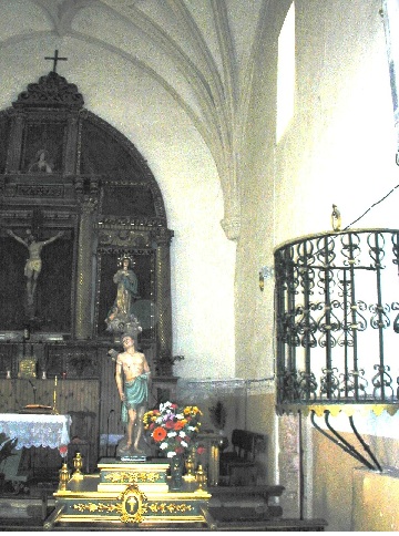 Sacristía nueva y púlpito de hierro forjado con paso de San Sebastián, al fondo retablo del Altar