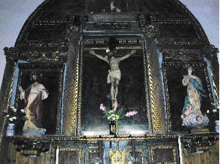 “El retablo del altar mayor, obra fechada sobre fines del siglo XVII tiene adornos de talla de tipo barroco y ocho pinturas sobre lienzo muy oscuras y sucias, destacando en la central, un magnífico calvario con tres figuras de buena ejecucion, colorido y actitudes, que recuerdan el hacer de la escuela del Greco en Toledo. Tanto las figuras de Cristo crucificado y su madre, como la de San Juan envuelto en ropajes ampulosos y con su mano derecha en la que junta los dedos medio y anular sobre el pecho, hacen pensar en dicha atribucion” * ( Segun texto de Antonio Herrera Casado ).